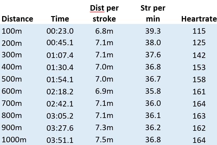 So, in the last 400m…for each 100m, the rating went up slightly, as did the distance per stroke, resulting in my second 500m being significantly faster than my first.