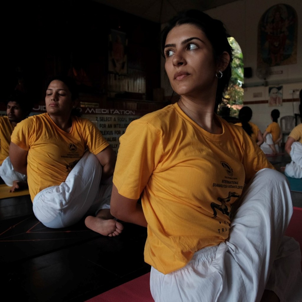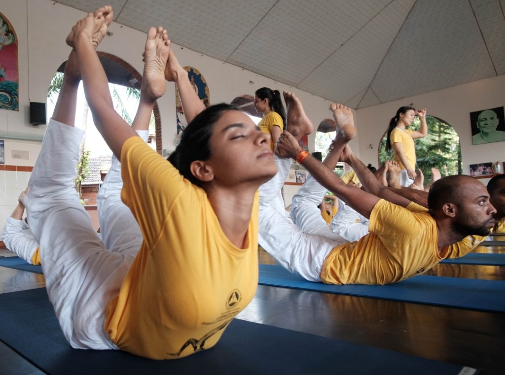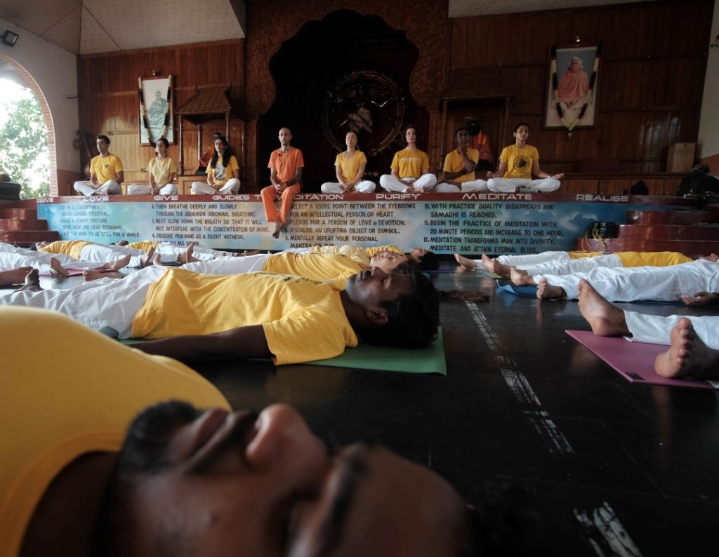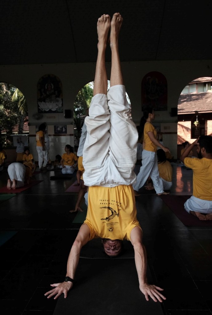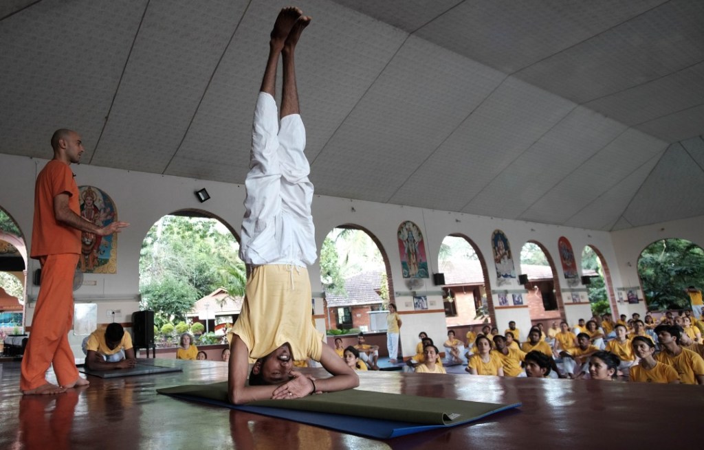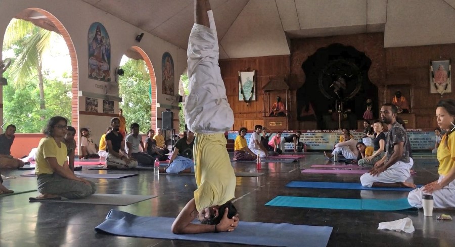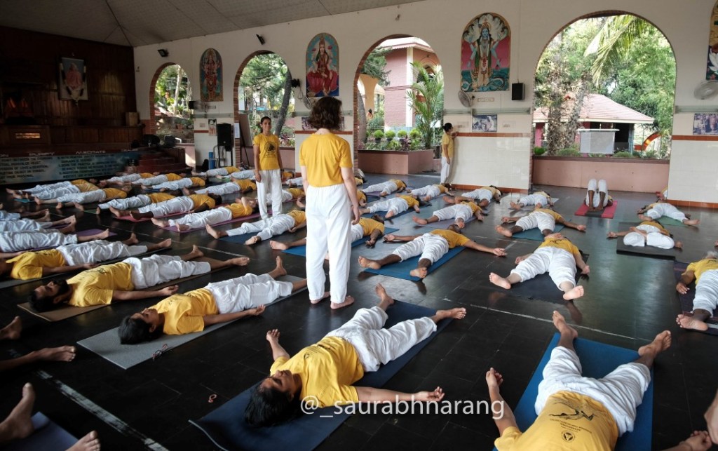 The course began as it would continue for the next 4 weeks, with a rigourously monastic timetable and no concessions to jetlag or individual sleep patterns. The day went something like this. Wake at 4.30 for a 5.00 am start with Pranayama (breathing exercises) followed by Meditation from 6.00 and then Satsang (mantra chanting). Then at 8.00 a lecture on anatomy, yoga scriptures, Sanskrit or some other curriculum topic. At 9.00 a supervised session of Asana yoga excercises. Then at 10.00, the first meal of the day – a breakfast of rice, beans and fruit. Back to work at 11.00 with a Karma Yoga session (housework tasks) followed by further lectures from 12.00, with an hour’s break at 2.00, an anatomy class at 3.00, followed by a second Asama class, then Dinner at 6.00 (usually rice with dal and a veg curry). A second Satsang session at 7.00, leaving about an hour and a half or so for writing up our class-notes and doing any set homework. Then to bed for lights out at 10.00 pm. In other words, not much spare time.