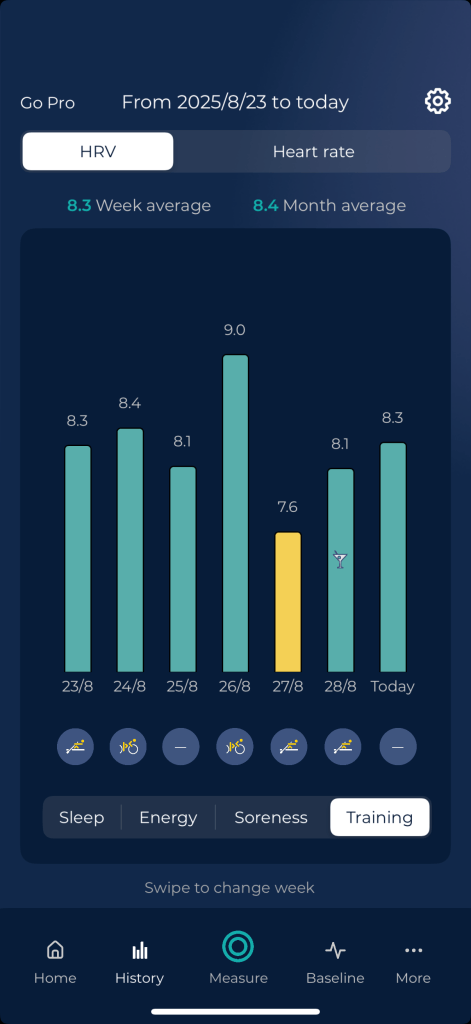 The low HrV often happens if you are about to become ill. If you train hard when you have low HrV you probably will get ill. Paying attention to it really does help to minimise “down-time”. When you have a stressed system … do more stretching or technical work, not a hard session. I have ignored it several times and regretted doing so. Several of the top school rowing programs have been using it now for well over a decade. I use an app called “Heart rate variability for training”, which was just one (of many available apps) recommended by my friend John Hale who is a serious cyclist/sculler and has been helping me plan my training for several years.