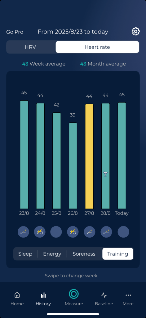 This meant I should limit intensity of training. I did. I was told this by an app I use in the mornings to check my heart-rate and HrV. I also had a slightly elevated heart rate. Yesterday my HrV was back to green for training, but HR was still slightly elevated. I forgot that the day before I had been told to “limit intensity”. I just remembered the “green: ok to train” for the day (I also forgot that I had mentioned this to Lorraine, who by the way said that she may well edit this blog post for me … now that my dad is not longer around to do so… Lorraine, sorry this text rambles somewhat!). Here are screenshots from my app showing the heart rate and HrV.